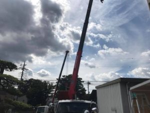 現地施工済みコンクリート上に、4分割仕様のガレージを設置してゆきます。本来なら、3分割にて製作可能なサイズなのですが、シャッター取り付け位置の都合上、4分割にて製作しました。長年の夢であるガレージ、できる限りご希望はかなえますよ。ダイナオガレージですから!!